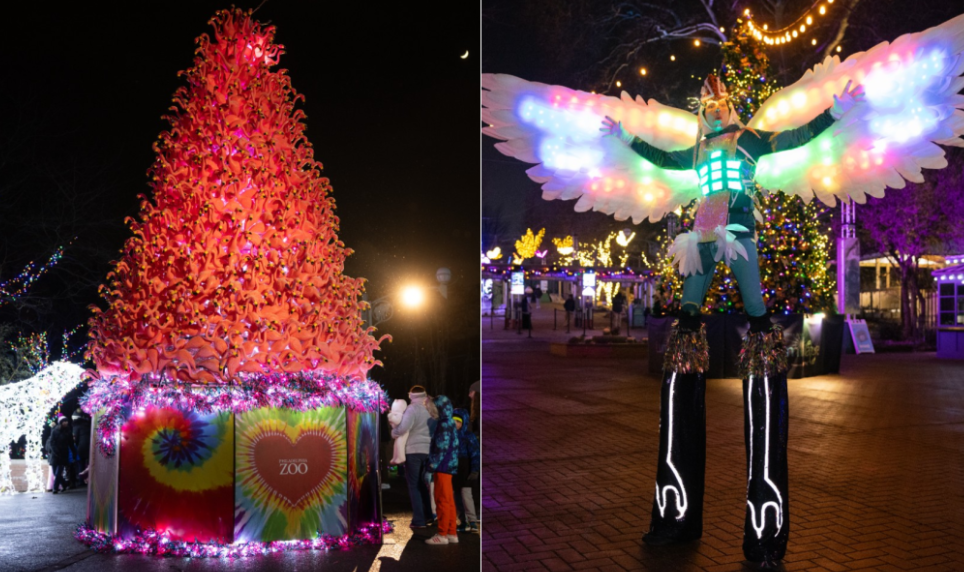 Displays include a 40-foot-tall penguin glowing with 40,000 lights and the iconic pink flamingo tree, built with 1,500 lawn ornament flamingos.