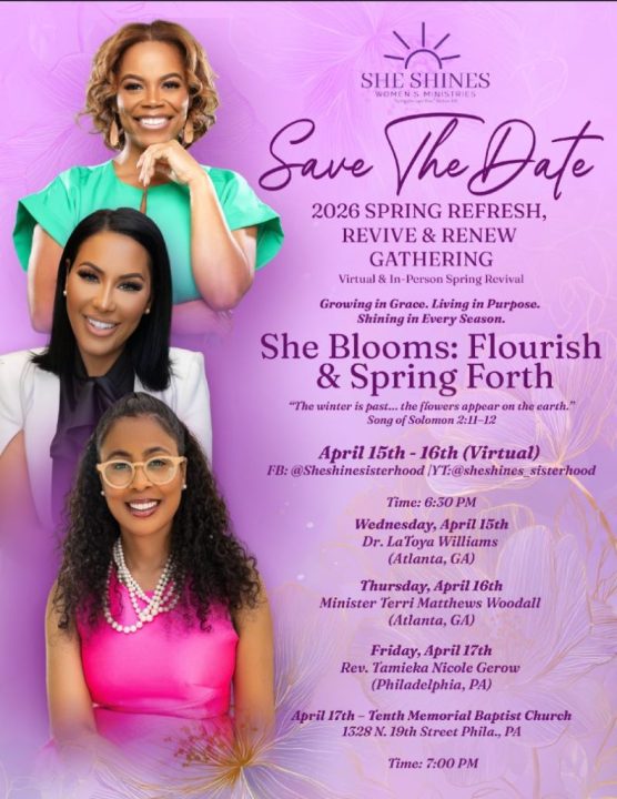 Wednesday, April 15 to Friday, April 17, 2026. Get inspired at She Blooms: Flourishing & Spring Forth, a three-day women’s revival and gathering. Engage in a “spiritual renewal in faith,” and an evening of uplifting worship, powerful teachings, and fellowship with other women of faith. Hosted by She Shines Ministries, a nonprofit and organizer of the annual She Shines Conference and Sisterly Affection Breast Cancer Initiatives, focusing on women of color.