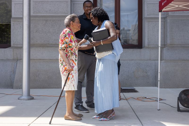 Honoring Sadie: Philadelphia Mayor Cherelle Parker greets Dr. Rae Alexander-Minter, daughter of the late Dr. Sadie T.M. Alexander, and Alexander’s nephew at City Hall on July 30. The occasion featured an announcement of the artist selection for a public-art sculpture of Sadie T.M. Alexander planned for installation on Thomas Paine Plaza in front of the Municipal Services Building across from City Hall. In 1927, Said T.M. Alexander was the first Black woman to gain admission to the Pennsylvania bar, launching a stellar career championing civil rights. She was one of the nation’s first Black women to earn a doctorate. Artist Vinnie Bagwell’s proposed rendering was chosen by an art committee, Dr. Alexander-Minter, and by an open public vote. It will be the city’s latest addition to one of the largest public-art collections in the United States. It will mark the second piece of artwork of a female African-American historical figure on public display in the city.