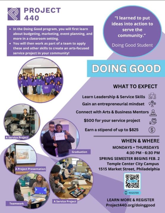Monday, February 2 to Thursday, May 14, 2026. Up to 30 Philadelphia high school students can register for the Doing Good spring semester. Open to students in the ninth to 12th grades, Doing Good is a hands-on afterschool educational program in classrooms led by experienced performers, artists, and educators. Learn budgeting, event management, setting goals, and planning a project. Use these skills on a team to develop an arts service project in your community. The program will be a 12-week program, starting in February. In a Shark Tank-style format, teams will pitch their original project ideas to a panel of experts before implementing. Each team will be get up to $500 to carry out their projects.They will earn a stipend of up to $825 at the end of the program. Meals and public transit passes will be provided. The initiative is organized by Project 440 designed to create service-based career learning opportunities for youth. Free; apply by pre-registering. Doing Good will be held on Mondays and Thursdays, from 4:30 p.m. EST to 6:30 p.m. EST. Temple University Center City Campus, 1515 Market St, Email: info@project440.org, 814-776-5440 or LEARN MORE or https://project440.org/doinggood