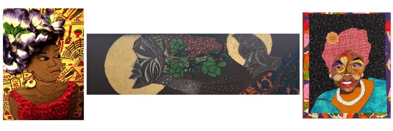 (Left to right): Debra Powell-Wright, My Skin is Black, mixed media quilt; Monna Morton, We Are Watching, acrylic on panel; Asake Denise Jones, Miss D, quilt. Courtesy of City Hall Art in City Hall program.