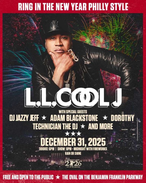 Wednesday, December 31, 2025. To kick off Philadelphia 2026’s year-long activities celebrating the signing of the Declaration of Independence, welcome in the new year at the New Year’s Eve Concert and Fireworks on the Benjamin Franklin Parkway featuring two-time Grammy® Award-winning LL Cool J. Emmy Award-winning music director and Grammy Award-winning writer Adam Blackstone will join the hip-hop icon. History and music go together in Philly like soft pretzels and salt. Philadelphia 2026, in partnership with Mayor Cherelle Parker, will host the event. The New Year’s Eve Concert will be followed by a fireworks display over the iconic Benjamin Franklin Parkway. If you like the city’s annual Wawa Welcome America July 4th festival concerts, you will enjoy this show. Free (general admission) on a first-come, first-served basis. Concert: 8 p.m. EST (Gates open at 6 p.m. EST); fireworks: Midnight. Eakins Oval/ Benjamin Franklin Parkway. Enter at security check-in locations: Binswanger Triangle at 2300 Benjamin Franklin Parkway; Pennsylvania Avenue and Spring Garden Street. Arrive early to avoid heavy motor and pedestrian traffic delays. For free weather and event updates, text “NYEPHL” to 888-777. www.phila.gov