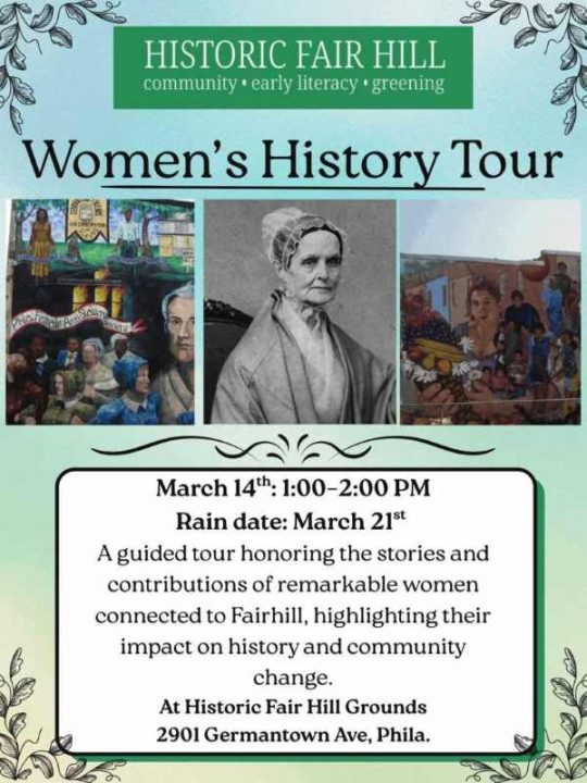 Saturday, March 14, 2026. Try a guided Women’s History Tour during Women’s History Month, honoring the stories and contributions of remarkable women connected to Historic Fair Hill. It is a national historic site that once served as a Quaker burial ground in Historic Germantown from 1703 until the 1960s. It was one of Philadelphia’s first racially integrated cemeteries. Prominent women’s rights activists and abolitionists from the 18th and 19th centuries are buried at Fair Hill, 2901 Germantown Ave.