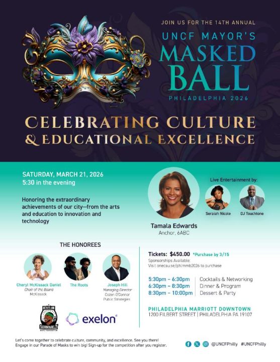 Saturday, March 21, 2026. Drum roll, please, as the Cheyney University Gospel Choir, featuring selections like “Lift Every Voice & Sing,” will lead the way at the United Negro College Fund Philadelphia’s 2026 Mayor’s Masked Ball fundraiser and awards ceremony. It is UNCF’s signature event, supporting life-changing scholarship efforts. It will be a night to shine. Hosted by UNCF Philadelphia and Mayor Cherelle L. Parker, five community and corporate difference-makers will receive the 2026 Mayor’s Masked Awards: Cheryl McKissack Daniel, President & CEO of McKissack & McKissack, who will be honored with the Individual Champion Award; the Exelon Corporation will receive the Corporate Champion Award, and The Michael Ann and Saquon Barkley Foundation will be the beneficiaries of the Community Support Champion Award. Joseph Hill, Managing Director of Cozen O’Connor Public Strategies, will receive the Advancing Young Leadership Award (ATLA), and hip-hop icons Philadelphia’s The Roots will be honored with a special Semiquincentennial Legacy Award to commemorate the nation’s 250th anniversary and signing of the Declaration of Independence in 2026.