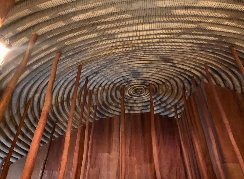 Muzibu Azaala Mpanga is entirely constructed of organic materials, including wood, thatch, reed, wattle, and daub. This is firmly in keeping with Ganda tradition and sacred architecture. It is circular in plan with a domelike overall shape. The circular form represents the eternal cycle of life. Intricate barkcloth artworks, royal regalia, and ceremonial items adorn the interiors, showcasing exquisite indigenous artistry.