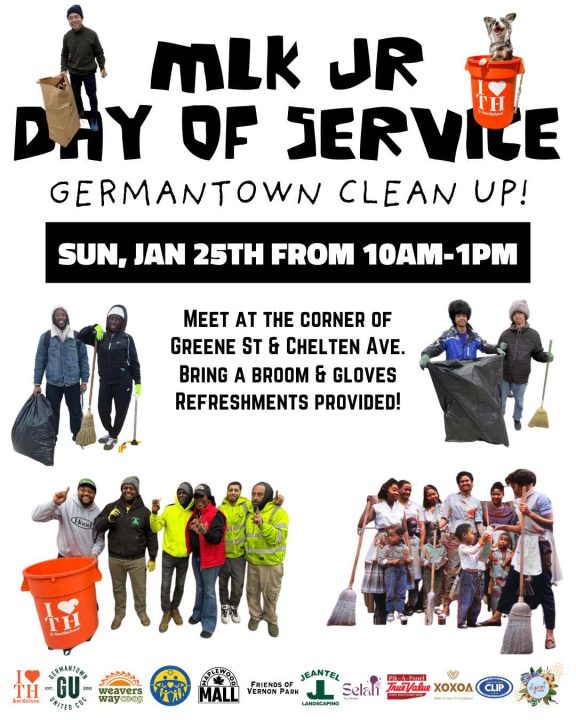 Sunday, January 25, 2026. There’s time to celebrate the legacy of Martin Luther King, Jr.by volunteering at the Germantown United CDC’s Day of Service: Germantown Clean Up. Get some exercise, socialize, and keep the streets sparkling at this neighborhood beautification effort, which was postponed from the weekend. BYOB (Bring Your Own Broom), refreshments provided. 10 a.m. EST to 1 p.m. EST. Corner of Chelten Avenue and Green Street. Email: info@germantownunitedcdc.org,