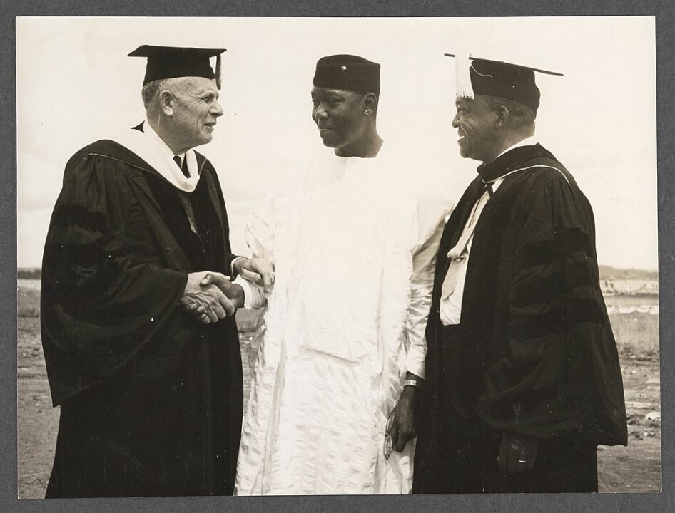 Dr. Nnamdi Azikiwe, in white robe and cap shaking hands with two professors or Lincoln University officials wearing cap and gown on both sides.
