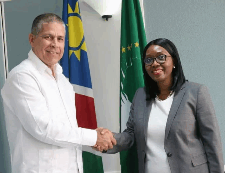Saara Kuugongelwa-Amadhila wearing a pant suit shaking hands with a man in white suit in front of national flags