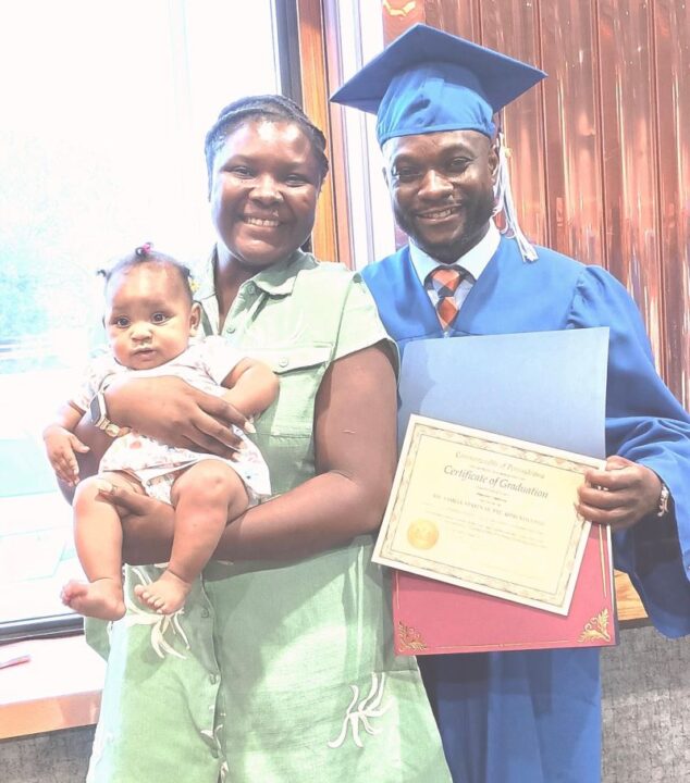 Guerschon Cetoute celebrates graduation with his wife and daughter. A Haitian-American, Cetoute has already interviewed with Local 592 Cement Masons Union.