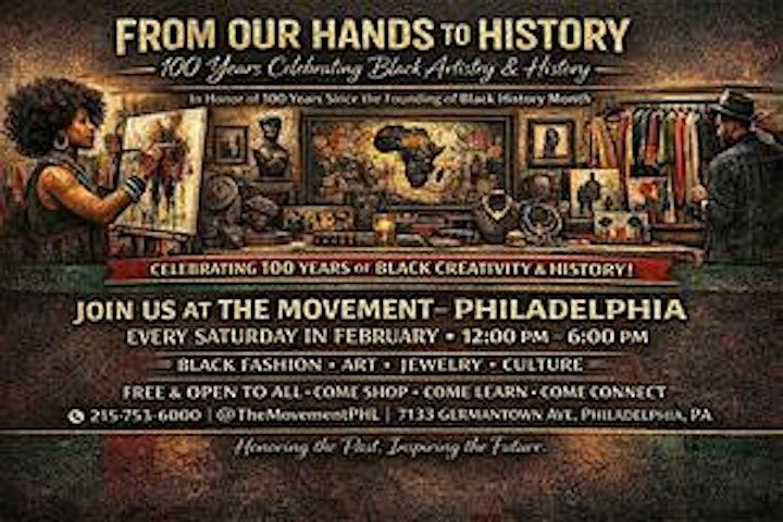 Free but pre-register; noon, Saturdays in February. The Movement Philly, 7133 Germantown Ave. 215-753-2000 or https://www.eventbrite.com/e/from-our-hands-to-historycelebrating-100-years-of-black-artistry-history-tickets-1980602110228
