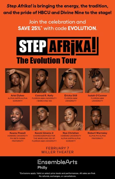 Individual tickets: $41 to $74 (Save 25 percent with the Code “EVOLUTION.” Inquire.) 7 p.m. EST. Miller Theater, 250 S. Broad St. 215-893-1999 or https://www.ensembleartsphilly.org/series-and-subscriptions/family-discovery-series/step-afrika or http://www.ensembleartsphilly.org.
