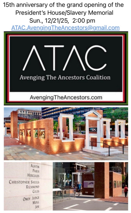 Sunday, December 21, 2025. It took the power of the community to create The President’s House/Slavery Memorial, a self-guided outdoor exhibit, near the Liberty Bell in Philadelphia’s historic district. That was more than a decade ago. Now, the home in the shadow of the birth of liberty is under the threat of being closed permanently. Come out to support and celebrate the 15th anniversary of the grand opening of the President’s House/Slavery Memorial hosted by the Avenging the Ancestors Coalition, a group leading the fight to save the memorial. The exhibit chronicles the paradox and struggle between slavery and freedom in the newly formed United States after the American Revolution. George Washington’s household was run by occupied indentured individuals who lived and worked on this site during his presidency. Nine Black men, women, and children lived at America’s first “White House.” Some of the enslaved individuals like Oney Judge managed to famously escape to freedom. The house was demolished in 1832 after the White House was moved to Washington, D.C. The accounts of daily life in the original president’s quarters are preserved through videos sharing the perspective of enslaved individuals, and text panels examine topics ranging from visiting tribal delegations to the early work of the executive branch. On display are the vestiges of the home’s embedded foundations. Free, 2 p.m. EST, 6th and Market streets (The free exhibit, with no tickets needed, is open daily, from 7 a.m. EST to 10 p.m. EST.) Email: AvengingTheAncestors@gmail.com, AvengingTheAncestors.com