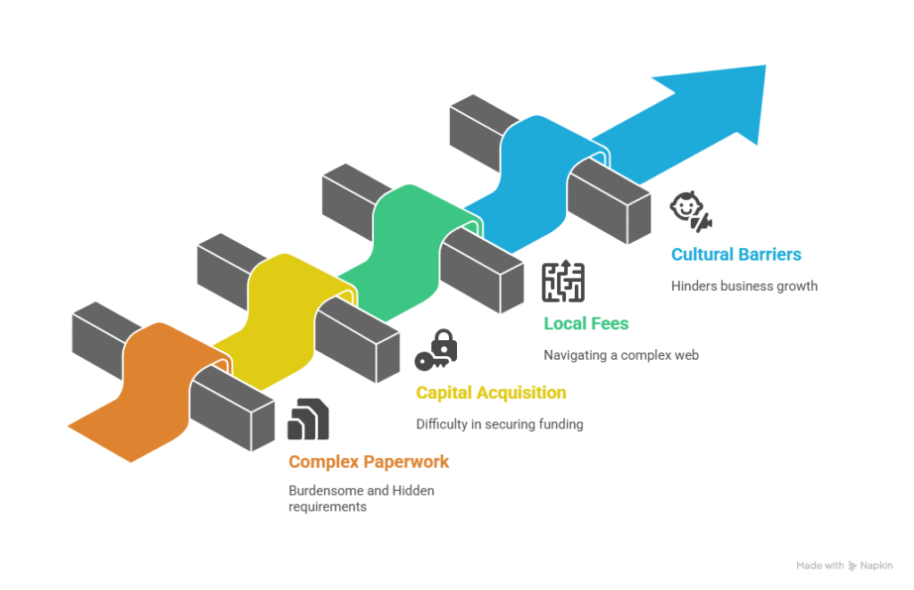 But it’s not just the paperwork; there is also the hurdle of getting capital, navigating a complex web of local fees and cultural barriers.