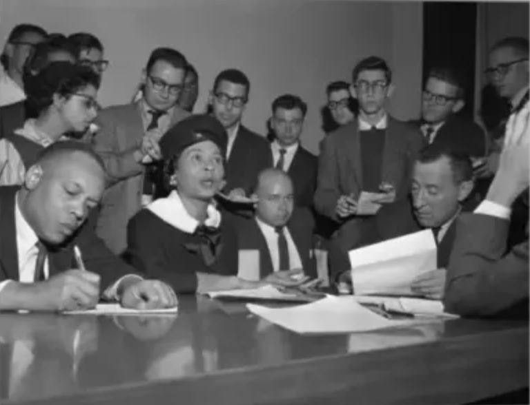 In 1954, the Supreme Court ruled segregated schools unconstitutional. After the ruling, Bates began gathering African American students to enroll at all-white schools. When the Little Rock Nine walked into Central High School in 1957, the entire country was watching. Bates selected nine students to integrate Central High School in Little Rock. She regularly drove the students to school and worked tirelessly to ensure they were protected from violent crowds. She also advised the group and even joined the school’s parent organization.